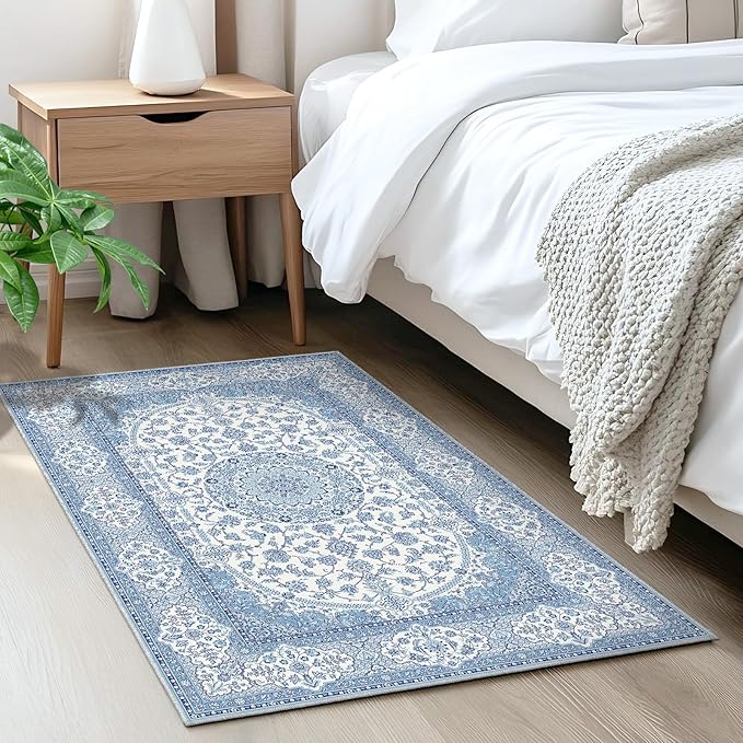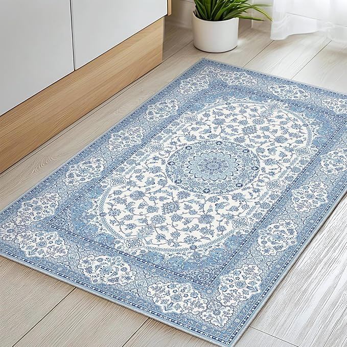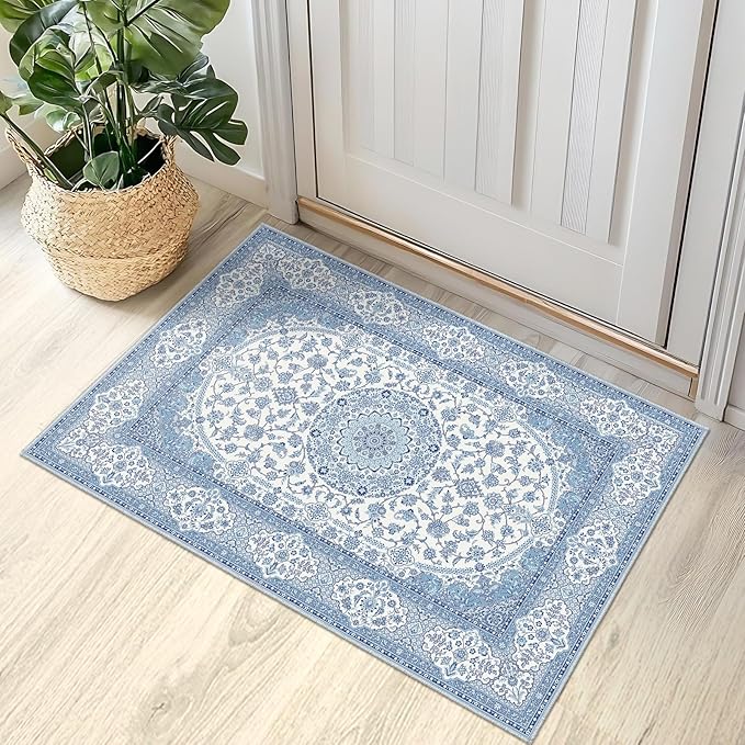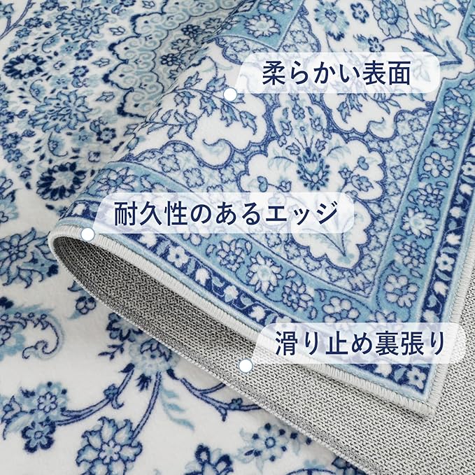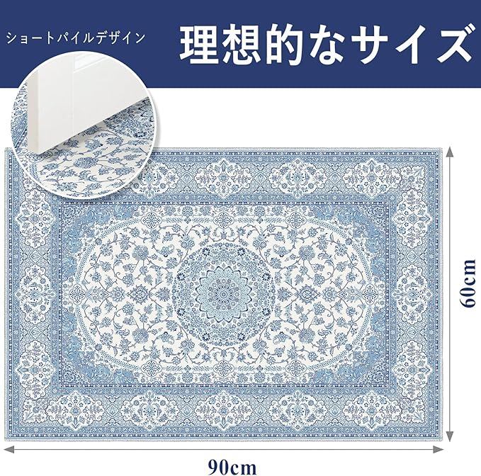 玄関マット 60 90cm 滑り止め 洗える ペルシャ風 ラグマット 花柄 ブルー 玄関 リビング 寝室用 薄手 軽量 防音 カーペット おしゃれ インテリアマット