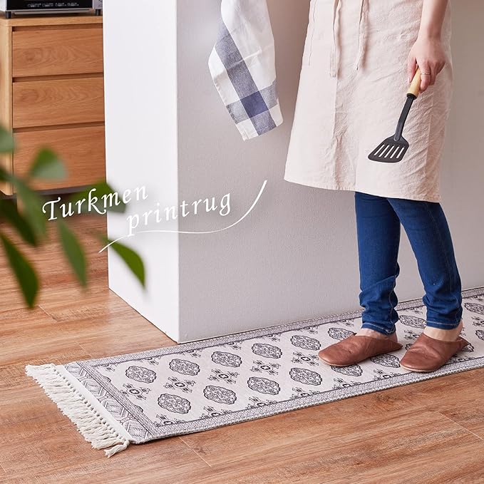 伝統的なトルクメン絨毯を再現した玄関マット。毛足がほとんどないため、さらっとした手触りです。ゴミが溜まりにくくお手入れも簡単。また、洗濯機で洗えるので汚れても清潔にお使いいただけます。玄関やベッドサイド、キッチンなどの水回りにもどうぞ。