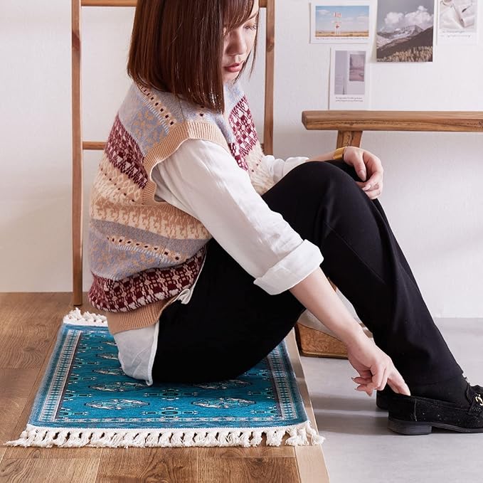 萩原 玄関マット 室内 屋内 ターコイズ 約45 75cm 「トルクメン風マット」 洗濯機で洗える 滑りにくい加工付き