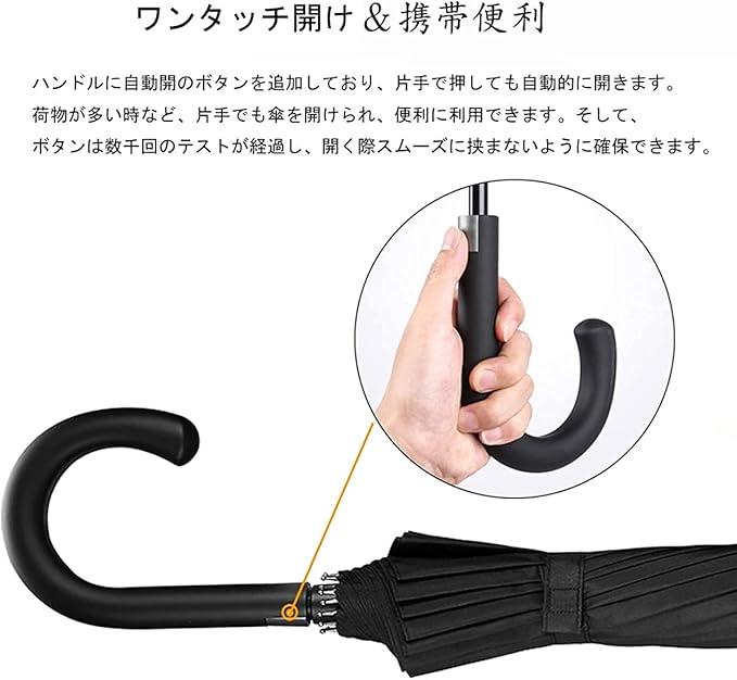 【ワンタッチ開け】ワンタッチ開けなのでボタンを押すだけで自動的に開けます。荷物が多い時や片手が塞がっている時、車の乗り降りなどに便利です。注意:閉じられない場合は、柄に対して骨をちょっとひねるか。