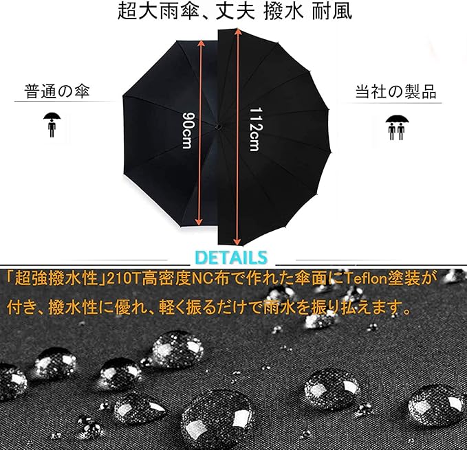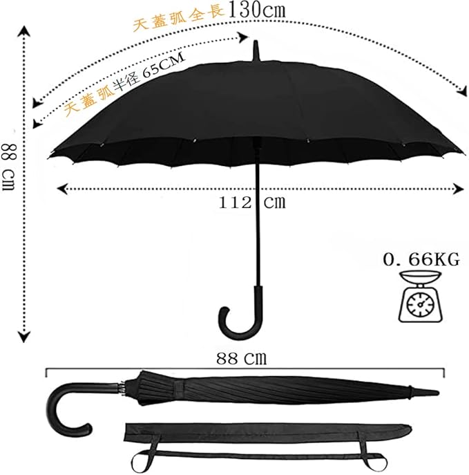 【傘仕樣】ストレート:全長さ:88cm、注意 持ち手と石突きを除いた部分の長さ:65CM、展開直径:112cm、天蓋弧全長:130cm、重量:660g、 骨の数:16本骨、傘骨:グラスファイバー