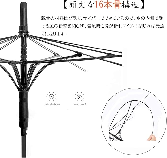 【16本骨&高強度】骨とティップ部分がファイバーグラスの素材で、耐用性とフレキシブル力も優れます。万が一ひっくり返ってしまっても、風の力を受け流し、風雨による衝撃を逃して強度を保ち、折りたためばすぐ元に戻れるから、風が強い日でも心強い耐風傘です。
