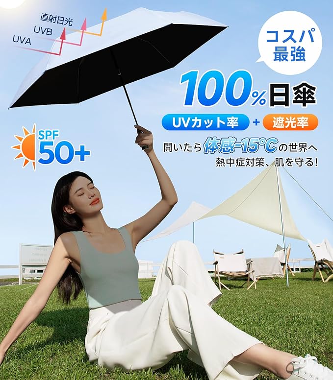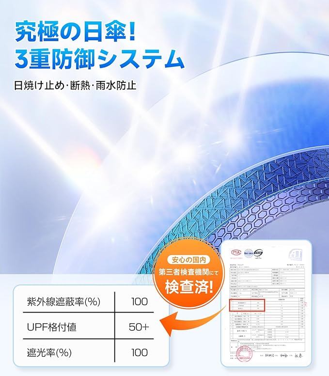 【JIS認証!究極の日傘—完全遮光遮熱・UVカット率100%】『日焼けたくない!』日差し対策。当社日傘は特殊高密度ポリエステル生地と遮熱コーティング技術により日差しの熱ストレスを軽減する設計で、第三者機関測定でUVカット率100%を確認、JIS規格に準拠した遮光性能を実現。開いた瞬間から、-15℃の冷却効果だけでなく、紫外線から肌を保護するだけではなく、厳しい暑さから身体を守る高い遮熱性を実現しています。通勤・買い物・お子様の送迎など、日中の外出時に重宝します。