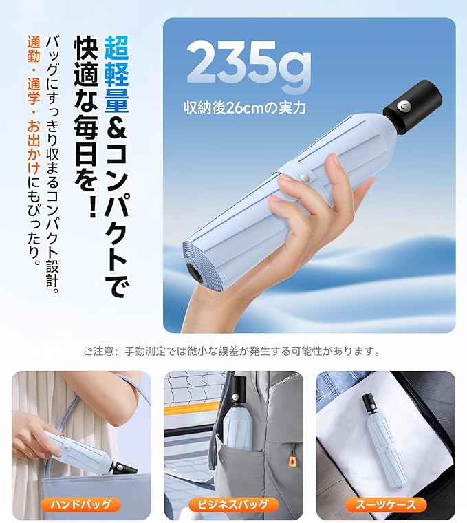 【365日持ち歩きたくなる極上コンパクト日傘】SILVLFのおりたたみ傘は、最先端テクノロジーを結集した235gの超軽量ボディ!航空宇宙技術にも使われる高強度ガラスファイバーと航空機用アルミ合金のハイブリッドフレームを採用し、驚異的な軽さと強度を両立。収納時わずか3.5cmの超スリム設計は、ビジネススーツの内ポケットにもすっぽり収まるほど。通勤・通学はもちろん、旅行やスポーツ、ショッピングなど、あらゆるシーンで「持ってて良かった」と思える使い心地です。