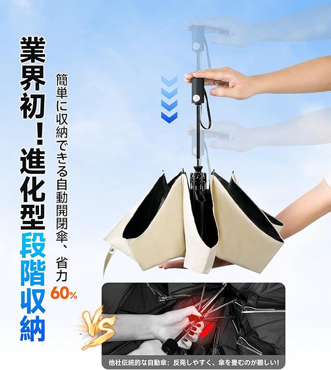 【革命的な進化!安全な段階収納 】業界初★完全ストレスフリー段階収納システム搭載の折りたたみ日傘が登場!SILVLFの自動開閉日傘は、これまでの「ギュッと力一杯押し込まないと閉まらない」「急にバネが反発して危ない」といったお悩みを全て解決しました。独自開発の段階収納機構で、一節ずつスムーズにたため、従来品より操作力を60%も軽減!力の弱い女性やお子様(小学1年生から)、ご年配の方でも、誰でも安心して使える親切設計です。「もう力任せに閉じる必要なんてない」とリピーター続出の大人気モデルです。
