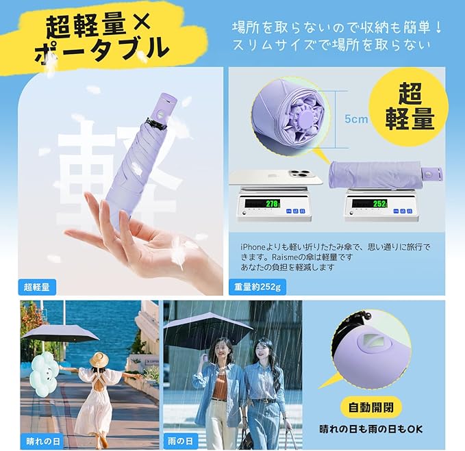 【コンパクトで軽量で丈夫】Raisme折りたたみ傘は、先進的で軽量で耐久性のあるポリエステル繊維とアルミ合金フレームを採用しており、軽量でコンパクトで丈夫です! 広げた時の直径は95CM、折りたたむと厚さはわずか5CMと超薄型コンパクトで、ポケットや化粧ポーチにも収まります! さらに、重さはわずか252グラムと非常に軽く、毎日の旅行に最適です。 通勤、通学、旅行、ハイキング、アウトドアなど幅広いシーンで活用でき、年齢や性別を問わず幅広い方にご使用いただけます!