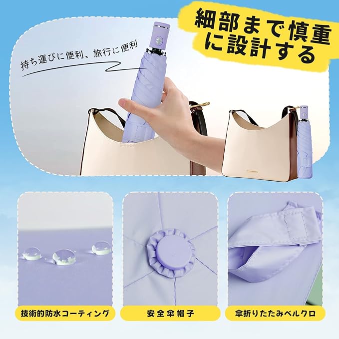 【晴雨兼用&防風】日傘は特殊加工が施されており、防水性能に優れ、内側は多層コーティング加工が施されており、紫外線を効果的に遮断できるので、日傘としてもご使用いただけます。 6本の骨は高強度、耐腐食性のカーボンファイバー製の耐風傘骨で作られており、接合部は複合加工で補強されており、強い柔軟性があり、強風にも耐えられます。