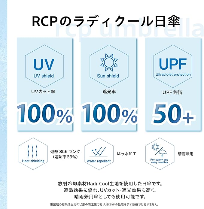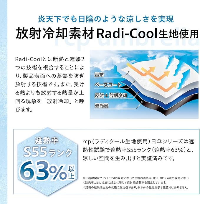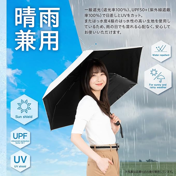 【性能】UVカット率100%(UPF50+)、遮光率100%(一級遮光)、遮熱率63%(S55ランク)。強い日差しや紫外線をしっかりブロックし、涼しく快適に。通勤、登校、観戦はもちろんのこと長時間の行列待ちにも必須のアイテムです。