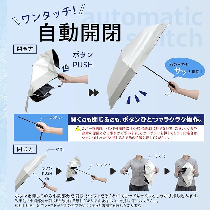 ワンタッチボタン式で押すだけでカンタンに傘が開きます。ボタンを押すだけで傘が閉じます。※カバー収納時、バンド使用時にはボタンを絶対に押さないでください。ケガや故障の原因となる恐れがございます。万が一ボタンを押してしまった場合は、シャフトをしっかりと押し込んで元の位置に戻してください。