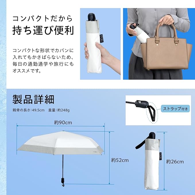 ●UVカット率99.9%(SPF50+)、遮光率99.99%(一級遮光)、遮熱率63%(S55ランク) ●ワンタッチボタン式で押すだけでカンタンに傘が開きます。