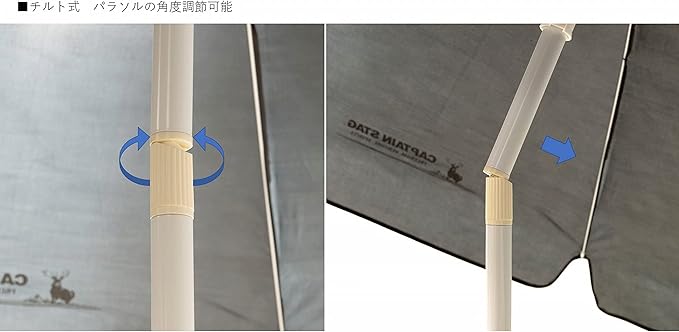 日差しの向きによってパラソルの上部を折り曲げて傾けられるチルトタイプ。