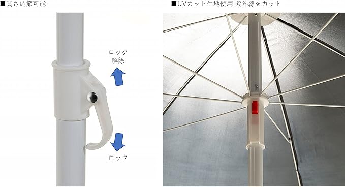 材質:傘生地の組成/ポリエステル100%(UVカット生地使用)、親骨の長さ/97cm、親骨・中棒/鉄(エポキシ樹脂塗装)、原産国:中国