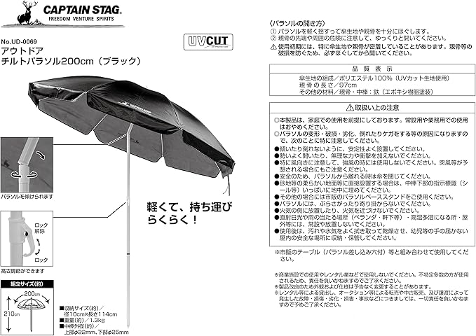 【Amazon.co.jp 限定】 限定商品限定商品 パラソル 傘 日傘 日除け UVカット アウトドア チルト パラソル 径200 高さ210cm 収納バッグ付き ブラック UD-69
