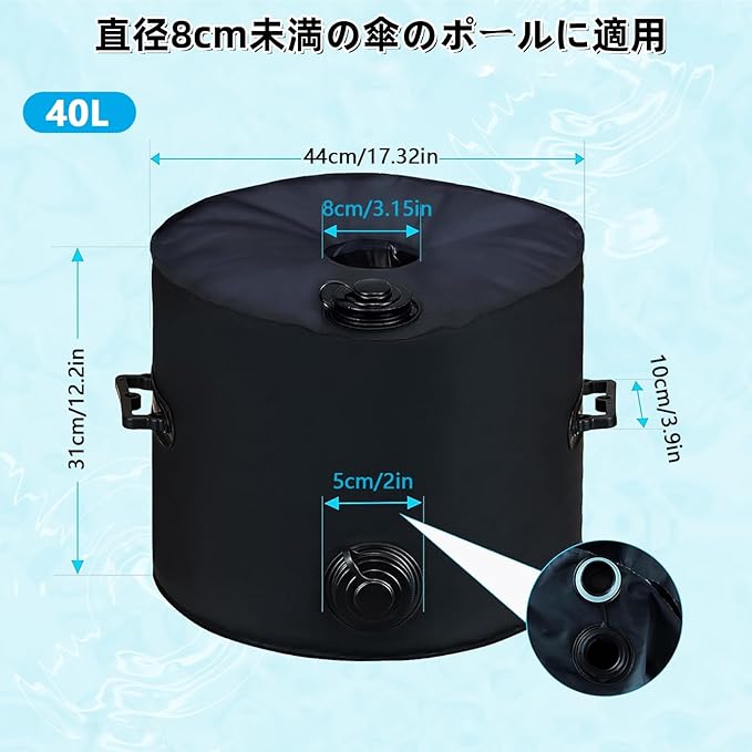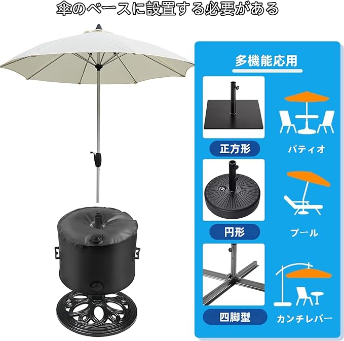 パラソルベース 注水式 40kg パラソル 重し 風に強い 傘ベースウェイトバッグ 簡単設置 パラソルウェイト 折り畳み ウォーターバッグ 直径8cm以下の傘ポールに対応 キャンプ用品 屋外 釣り ベランダ ビーチ 公園 Umbrella Stand