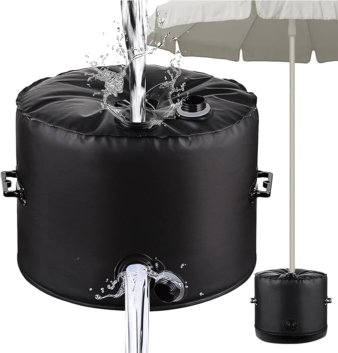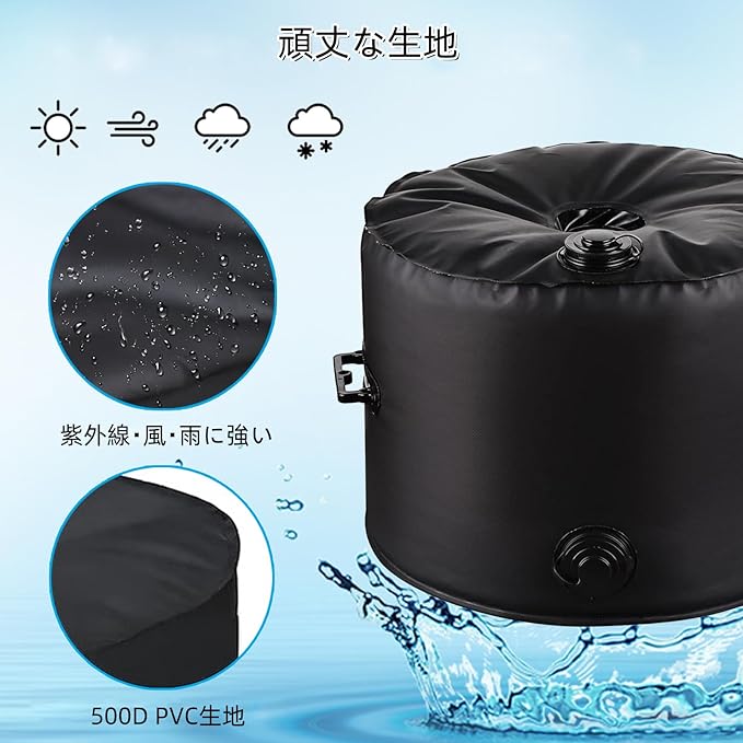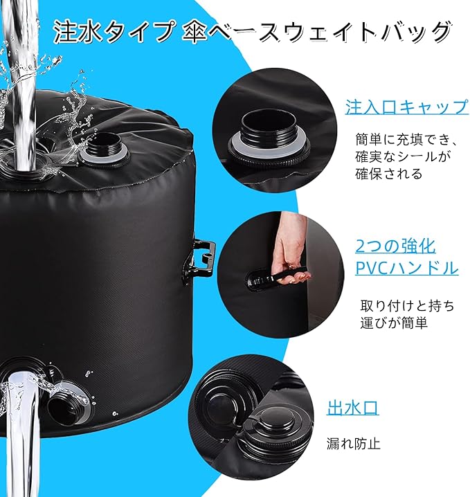 【注水式パラソルウェイト】傘のベースウェイトバッグには、簡単に充填できる高品質のカバー付き水穴が2つ付いています。 上部の穴は水を入れるためのもので、側面にある注水口から素早く簡単に水を入れることができます。 使用後は中の水を抜けば軽くなるので持ち運びにも便利です。