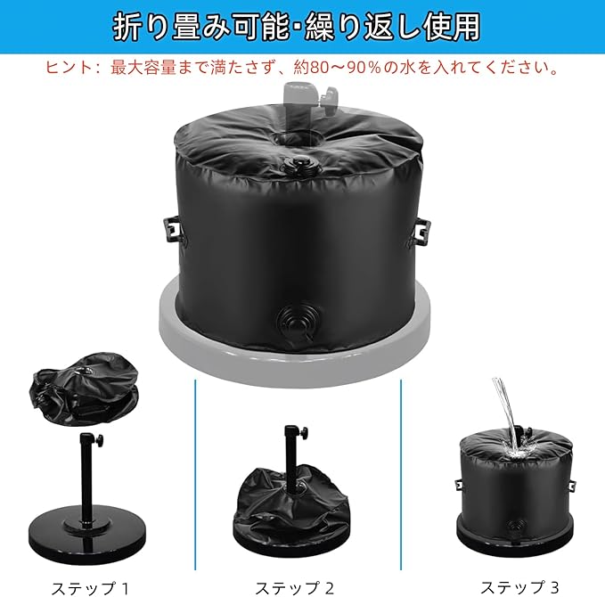 【折り畳みタイプのパラソルベース】パラソル 重しには2つの強化PVCハンドルが付いており、取り付けと持ち運びが簡単です。 使用しないときは折りたたんで保管でき、スペースをとらず、繰り返し使用できるように設計されており、便利で耐久性があります。