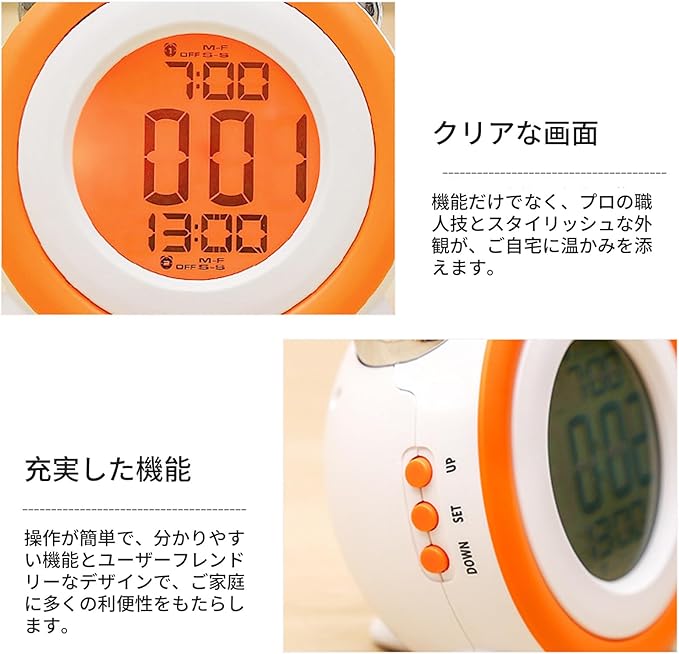 大音量 静音:デジタル式表示で、チクチクの音がしません。ベル式で大音量でアラームが鳴ります。年月日が正しく設定されないと、アラームが鳴らないことがあります。