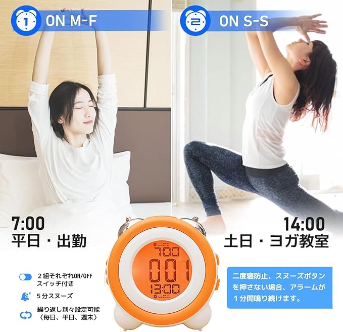 ダブルアラーム: アラームを2組設定できます。アラーム1/アラーム2 それぞれ独立設定可能:繰り返し:平日・週末・毎日 ON/OFFスイッチ付き 5分スヌーズ。スヌーズしない場合:大音量で1分間鳴り続けます〈1回きり〉スヌーズボタン以外のボタンを押すと、アラーム解除できます。