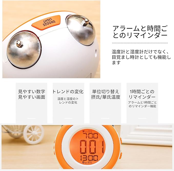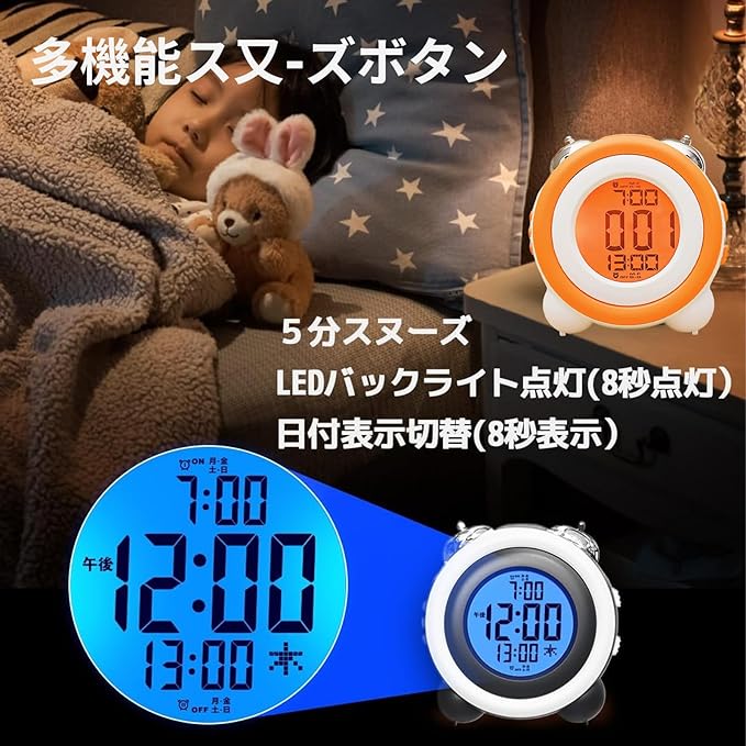 多機能スヌーズボタン:アラームが鳴った時、スヌーズボタンを押して5分スヌーズできます。スヌーズボタンを押すと、バックライトが点灯します(8秒点灯)。もう一回押すと、日付表示になります(8秒表示)。