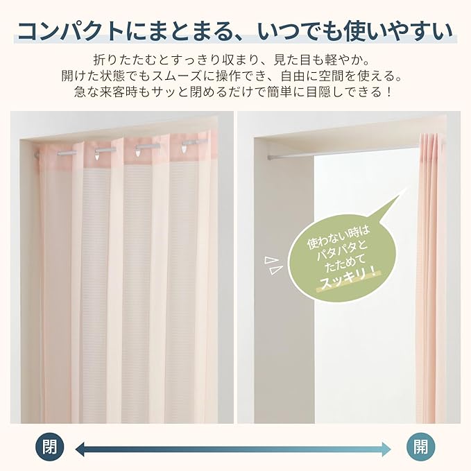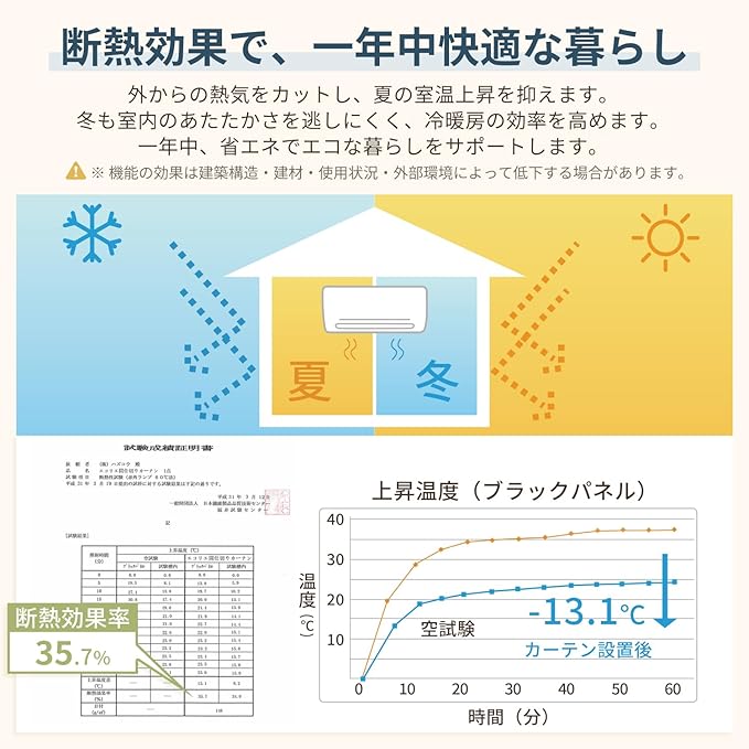 【断熱&省エネ効果】窓やお部屋の仕切りとして使用することで外気の影響を軽減し、冷暖房効率をサポート。夏は冷房時の熱気を遮り、冬は暖房時の暖気流出を抑制。電気代の節約と省エネを実現し、季節を問わず快適な住空間づくりに役立ちます。