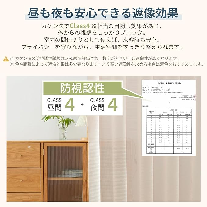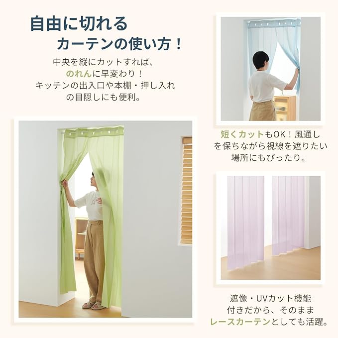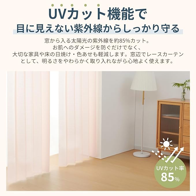 【プライバシー保護・UVカット】紫外線を約85%カットして、肌ダメージや家具の日焼けを軽減。レースカーテンのように柔らかな採光で、心地よい明るさをキープします。仕切りとしても目隠し効果が高く、来客時の視線を気にせず安心。暮らしに欠かせない多機能カーテンです。