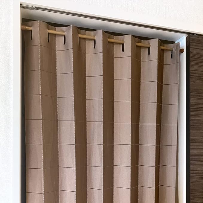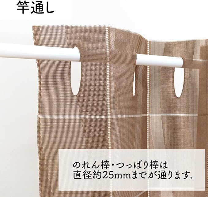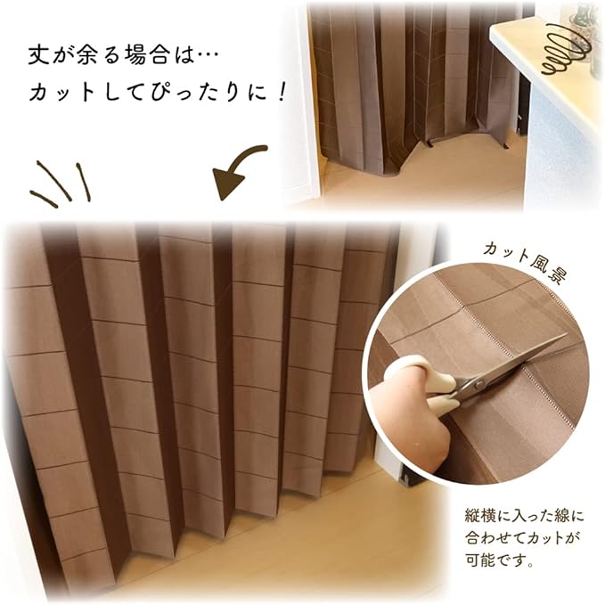 【仕様】サイズ調整が可能。縦横(約)10cm間隔に入っているカットラインに沿ってハサミで切ることができます。竿通し部分まで切らないようにご注意ください。直径約3cmのポール(棒)をギリギリ通すことができますが、直径約2.2cmくらいまでのポールの使用がおすすめです。 (※つっぱり棒をご使用の場合は、両端のキャップの太さも考慮してください。キャップが取り外せるものもございます)生地幅は約95cmですが、50~85cm幅くらいまでの場所での使用がおすすめです。