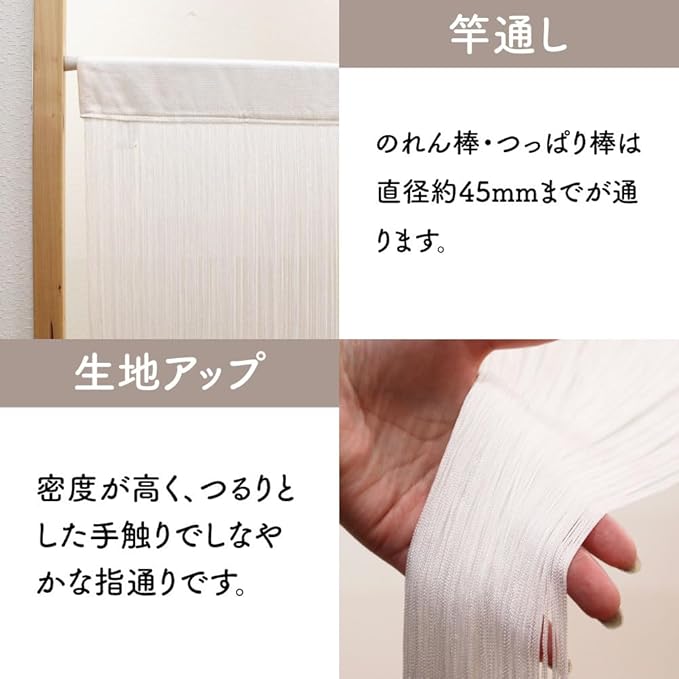 のれん工房のストリングカーテンは、レーヨン100%の紐で編み込まれた、しなやかで絡みにくい、弾力のある糸を特徴としています。約90cmの幅と210cmの丈を持ち、直径約4.5cmまでのポールを通すことができます。向こう側が透けて見えるため、奥が気になりません。光を取り込む透け感が心地よい、密度の高いストリングカーテンで、空間を仕切ることができます。美容室やバーなどのサロン、飲食店にもおすすめです。アイロンは低温でおかけください。