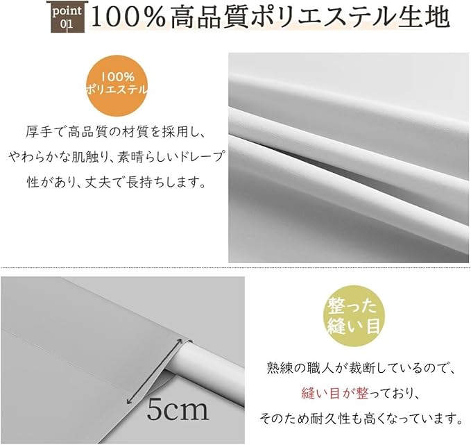 【遮光・防寒保温・省エネ】夏:密度の高い繊維が太陽光紫外線の侵入を抑制し、高い断熱性を発揮する。冬:密度の高い繊維が冷気や隙間風の侵入を抑制し、保温性を発揮する。遮光性も防音性もあり、シンプルカラー生地なので、洋風、北欧風、和風、そしてモダンなお部屋によく合います。