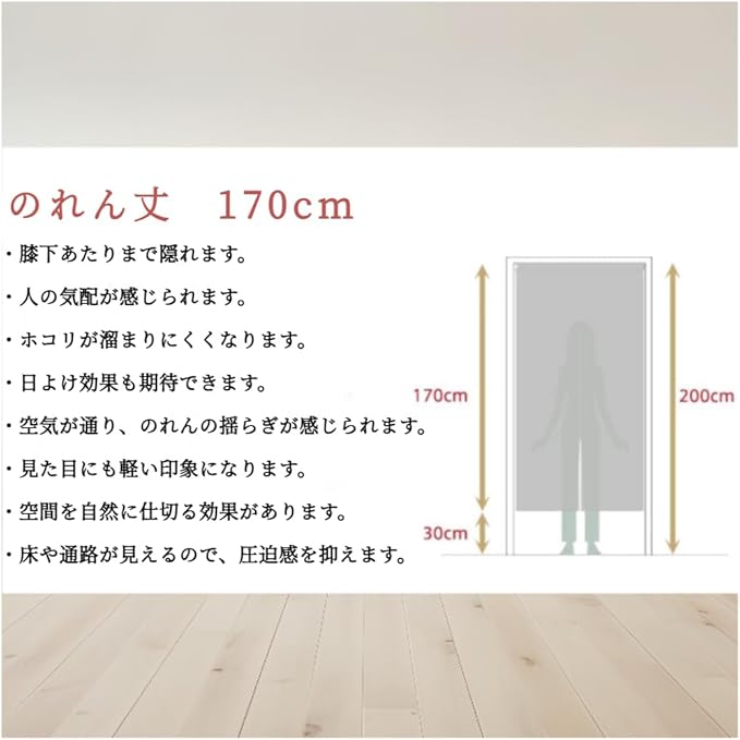 【用途】リビング、玄関、階段、廊下、脱衣所の間仕切りや目隠しにいろいろな場所、いろいろなシーンでお使いいただけます品の良いのれんです。プライバシーも守れます。お部屋のインテリアとしてはもちろん、飲食店、居酒屋等の商業施設によく合うのれんです。海外のお土産、プレゼントにも喜ばれます。