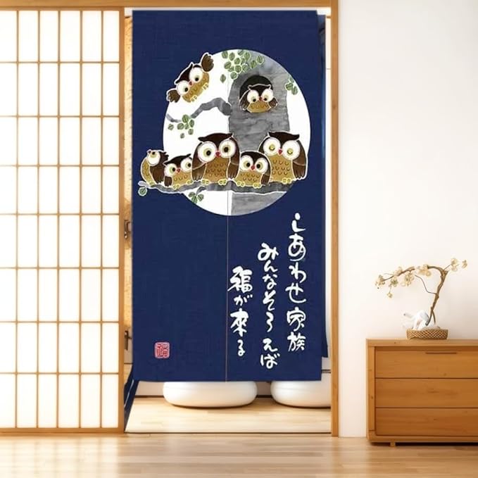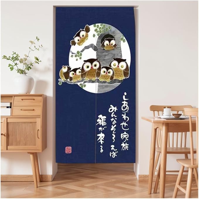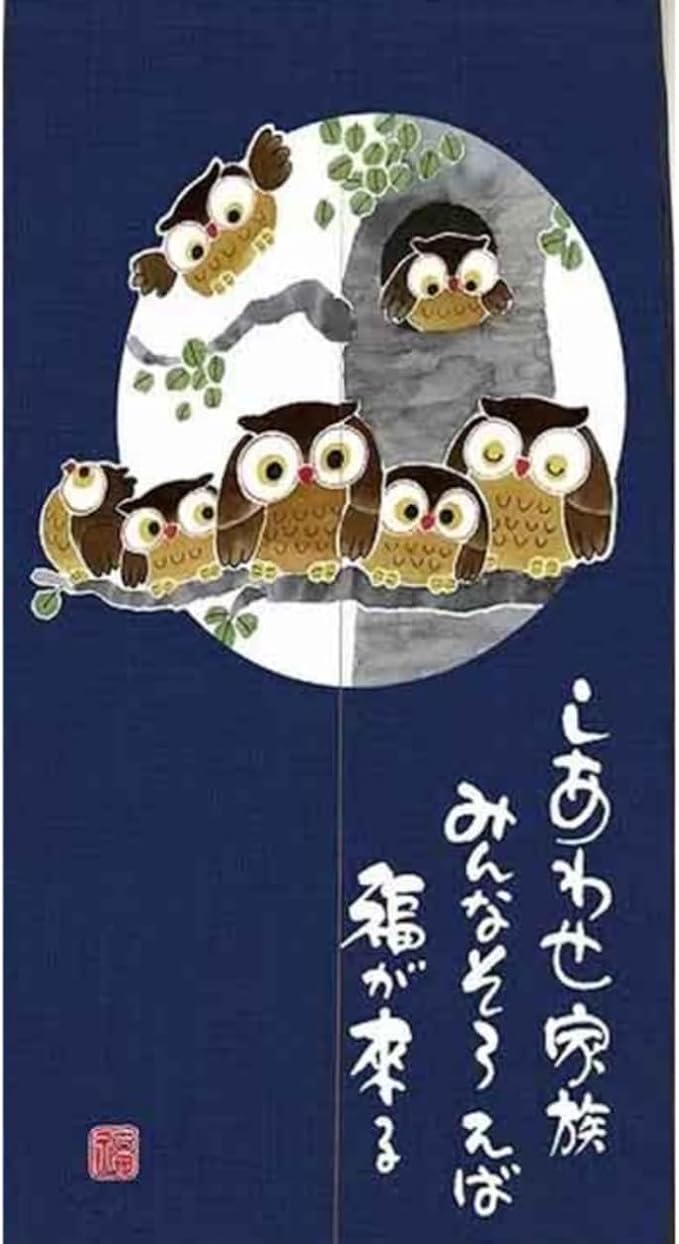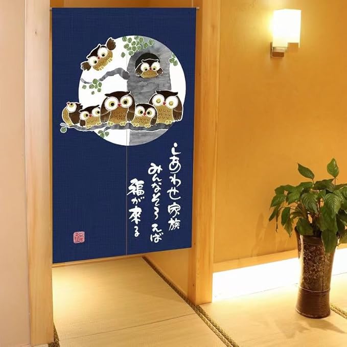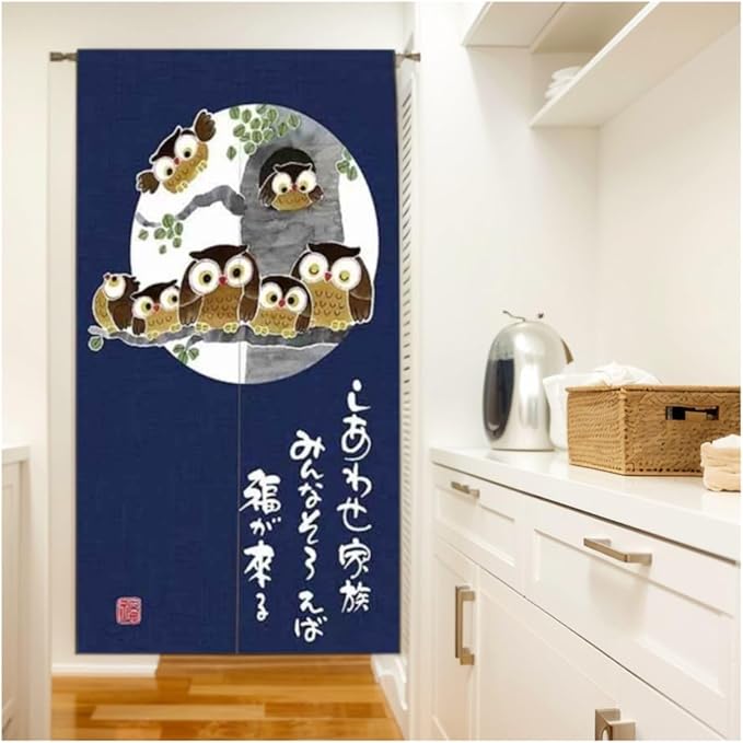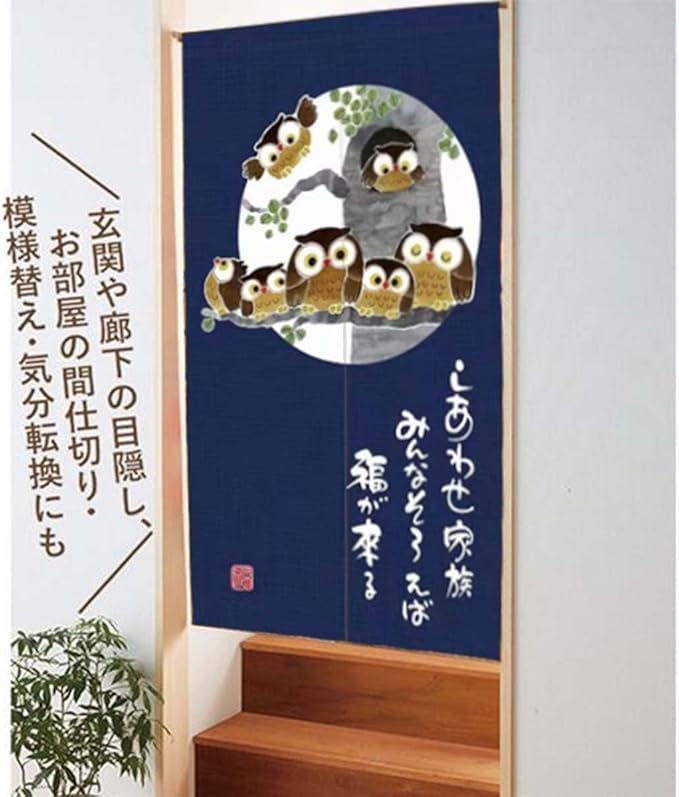 のれん 暖簾 おしゃれ 和風 間仕切り カーテン ロング 玄関 階段 廊下 リビング 脱衣所 お風呂 戸口 目隠し 遮光 プライバシー保護 ドア 仕切り (フクロウ家族, 幅85cm x丈170cm)NR1407