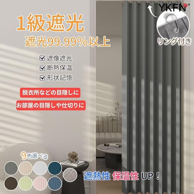 【1級遮光・プライバシー保護 】:遮光率:約99.99%以上 簡単に目隠しや間仕切りになるアコーディオンカーテン。「玄関や入り口のドアを代わりに」「リビングの断熱に」「窓回りの断熱に」「お部屋の間仕切りに」「キッチンの目隠し」「階段からの冷気・暖気遮断」「玄関の目隠し・空気の入れ替え時」「オフィスやビルなどのガラス張りの遮光、ブラインド代わりに」「お風呂の仕切りに」「脱衣所・更衣室の目隠し・防寒」「洗面スペースの間仕切りに」