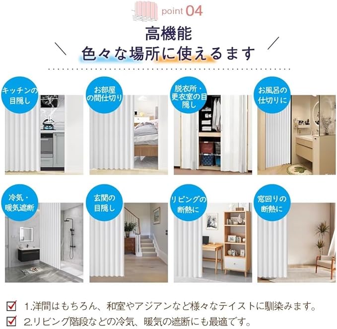 【機能】目隠し:玄関に掛けてお客様や宅配ドライバーから目隠し/収納の目隠し/店舗でバックヤードを目隠し/飲食店で厨房を目隠し *仕切り:扉がない部屋を間仕切り/広すぎる部屋を仕切って省エネ、節電/リビング階段を仕切って防寒 *入口に掛けて:お店の営業中の合図/表札、看板として/ドアプレート、ルームプレート替わり/トイレサインとして