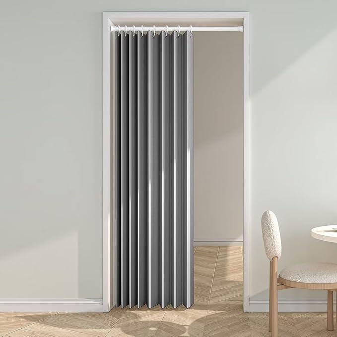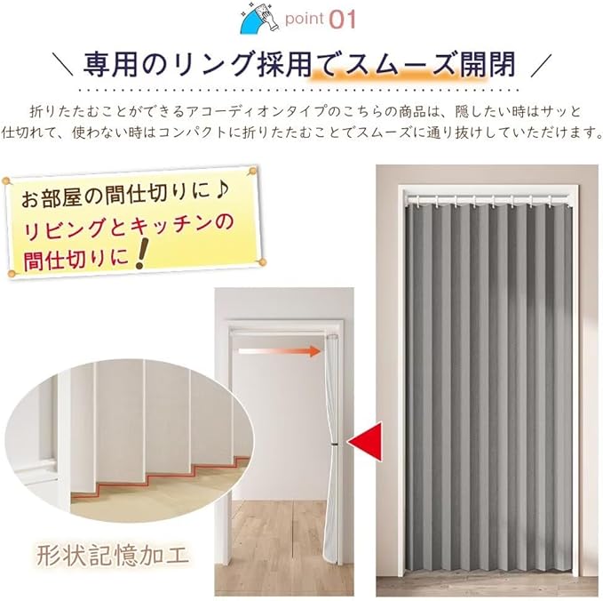 【専用リング付き・取り付け簡単!】:フックなどは不要です。一般的な突っ張り棒を通すだけで簡単に設置できるアコーディオンカーテン。 ◆リング直径:(約)4cm ◆上部リング部分がナノミュートリングでカラカラ音がせず、開け閉めの横滑りがスムーズに動かせます。不要な時は畳んでおけば、場所をとりません。