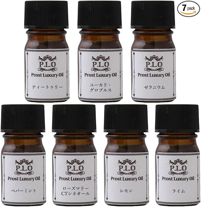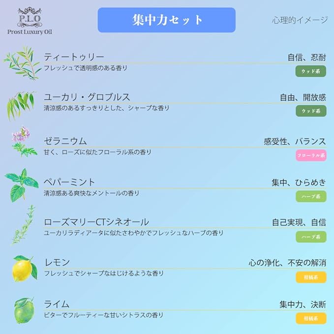 集中力セット Prost Luxury oil ピュアエッセンシャルオイル 1.ティートゥリー 2.ユーカリ・グロブルス 3.ローズマリーctシネオール 4.ペパーミント 5.ゼラニウム 6.ライム 7.レモン 合計:2ml 各1本