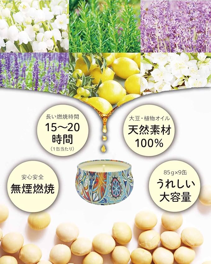 ✅【長時間燃焼】 各大豆キャンドルのサイズは85g、直径は6.5CM、高さは4CMです。100%大豆ワックスキャンドルは、パラフィンワックスよりもゆっくりと長く燃焼し、約25~30時間燃焼できます。無煙・無毒で、空気を汚染せず、その日の気分に合った快適な雰囲気を作り出します。