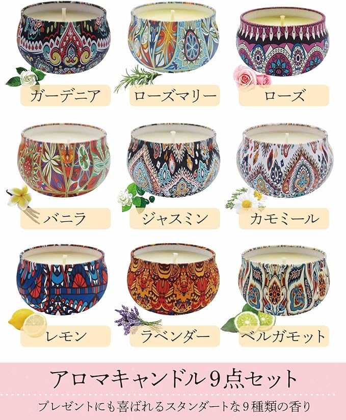 ✅【スタンダートな数種類の香り】 このアロマキャンドルギフトセットにはの9種類のフレグランスが含まれ、アロマテラピーをご家庭でいつでもお楽しみいただけます。スタンダートなバニラ・ローズ・ラベンダー・ジャスミン・カモニール・レモン・ローズマリー・ガーデニア・ベルガモットの9種それぞれの独特の香りが漂い、リラックスして幸せな気分になります。 アロマキャンドルの香りは心地よい雰囲気を演出し、ストレス解消や気分の改善にも役立ちます。
