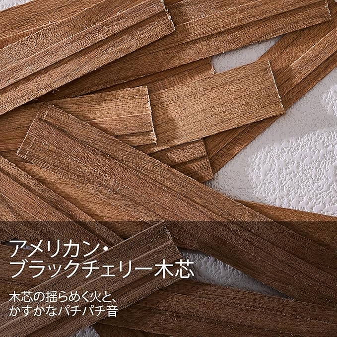 「パチパチ木芯の魅力」:アメリカ産ブラックチェリー木の贈る癒しの時間。特別に選ばれたアメリカ産ブラックチェリーの木製ウィックが、キャンドルの燃焼を一段と豊かな体験に昇華します。燃焼時のパチパチとする音は、森の焚火やキャンプファイヤーの温かさを彷彿とさせ、視覚・聴覚・嗅覚の五感を楽しめる癒しの時間を創造します。木質特有の自然な風合いで、香りの拡散を効率的に高め、長時間にわたり一貫した香りを感じられます。