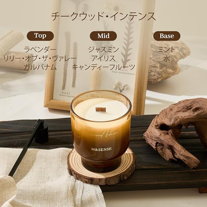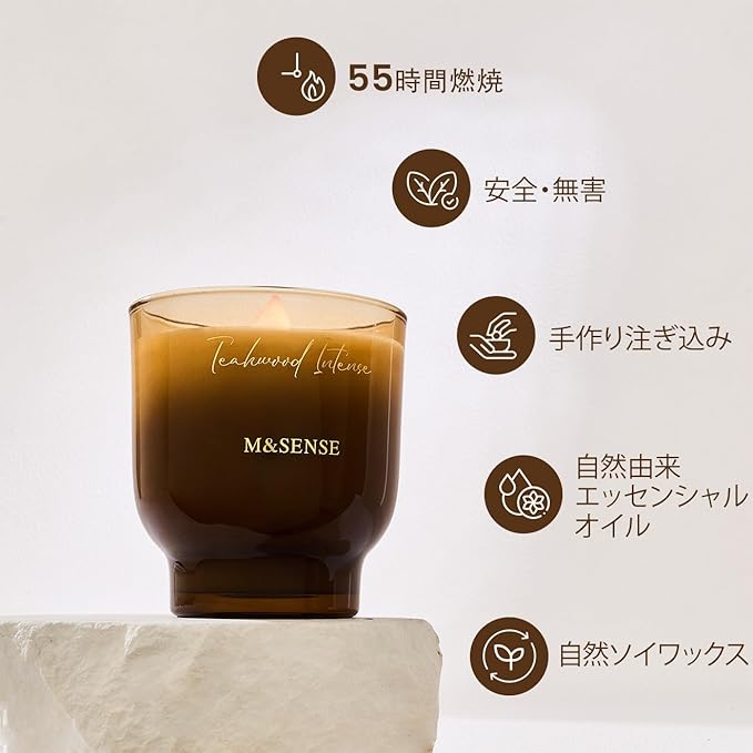 「無毒で安全」:M&SENSE のキャンドルは、パラフィン・フタリート・パラベンを含まない 自然由来成分 の素材を使用。煙の少ないクリーンバーンでペットのいる家庭でも安全にお楽しみいただけます。肌に優しい成分で仕上げたこだわりの香りは、心と体を癒す癒しの時間をサポートします。