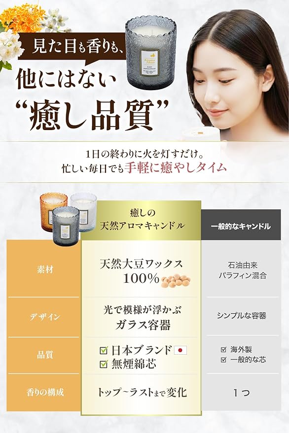 ・【100%天然素材】:天然精油&大豆ワックスから作られた100%天然素材のアロマキャンドルです。絶妙にブレンドされた香りは、まるで美しい自然に囲まれているように錯覚させます。無煙綿芯を使用する事で、香りが早く広がり、すすが出にくく、火を消した時に嫌な匂いがしにくい特徴がございます。