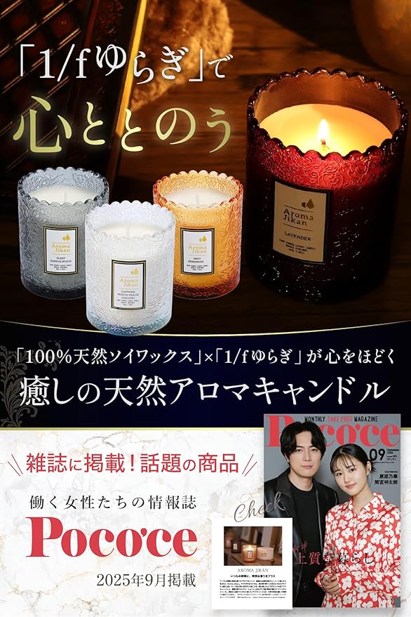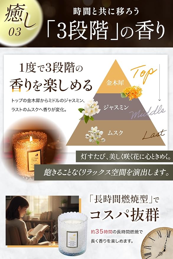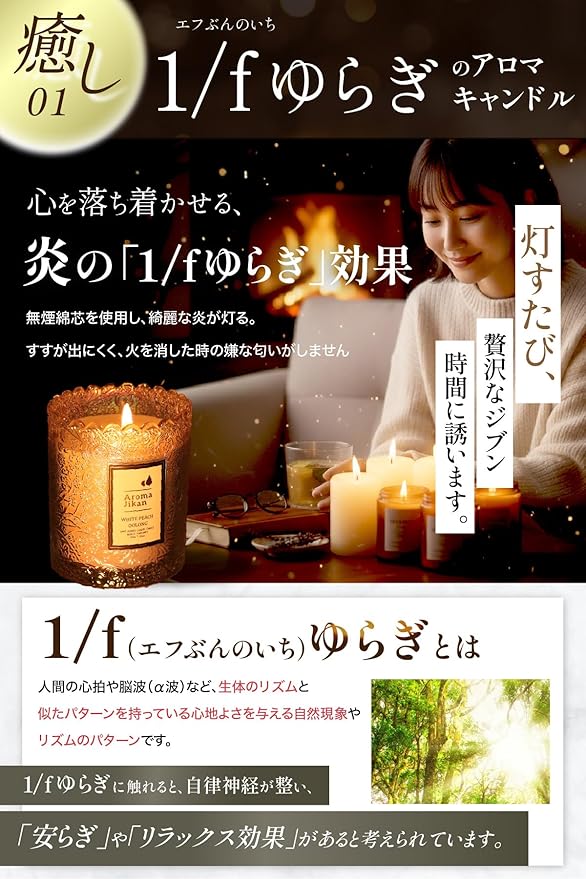 ・【お気に入りの香りをお選び下さい】:アロマキャンドルの炎には、副交感神経を刺激する効果があり、リラックスを促す作用が期待出来ます。また、炎の揺らぎは「1/fゆらぎ」と言われ、心を落ちつかせる作用があると言われています。下記のフレグランスを御用意しております:Mokuren(木蓮)、BerriesRose(バラ)、WhitePeachOolong(白桃ウーロン)、Lavender(ラベンダー)、BlackCedar&Juniper(森の香り)、LimeBasilOrange(ライムバジルオレンジ)、Sandalwood(白檀)、Kinmokusei(キンモクセイ)、Jasmine(ジャスミン)。