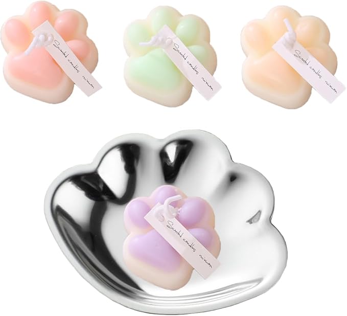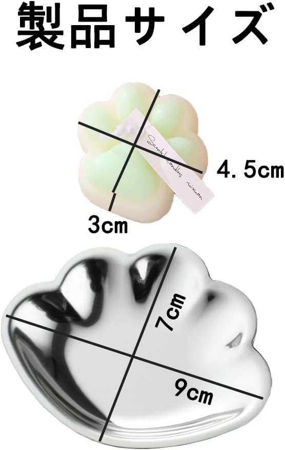 【パッケージ内容】:猫の肉球のアロマ・キャンドル(4本)、シルバーシェル・トレイ付き。