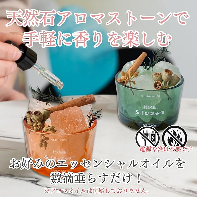 【天然石のアロマストーン】 アロマオイルを数滴垂らすだけで、天然石がオイルを吸収し、ふんわりと優しい香りを広げます。火や電気を使わず、手軽にアロマを楽しめるため、リラックスしたいときや気分を切り替えたいときにぴったりです。