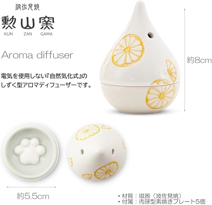 J-kitchens ディナー アロマディフューザー 波佐見焼 日本製 5.5x8cm 肉球型 アロマストーン (アロマ プレート)5個付 レモン PNO604733