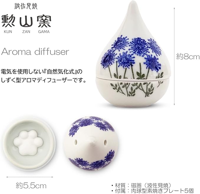 J-kitchens ディナー アロマディフューザー 波佐見焼 日本製 5.5x8cm 肉球型 アロマストーン (アロマ プレート)5個付 野花 ブルー PNO608557