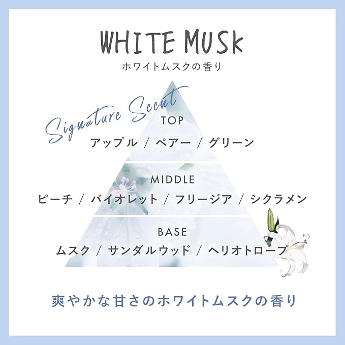 サボン系の爽やかさとホワイトフローラルのほのかな甘みをあわせたホワイトムスクの香り
