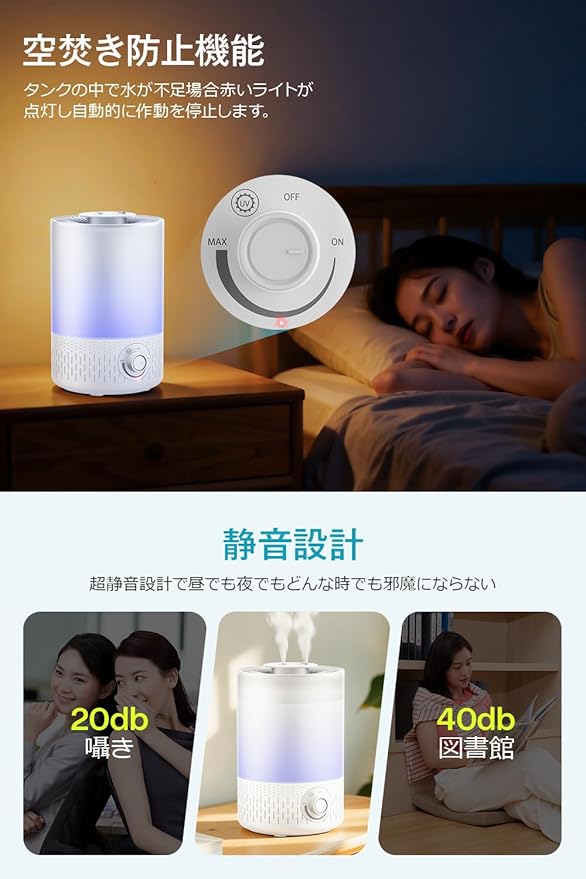 【上部給水式・360 ダブルノズル】重たいタンクを持ち運ぶ必要はありません。フタを外して上から直接給水できる便利なトップフィル方式を採用。さらに2つの吹出口は360 回転し、乾燥を防ぎたい方向へ自在にミストを噴霧。お部屋全体を効率的かつムラなく潤します。この加湿器には空焚きを防ぐ機能が備わっており、水不足時には自動的に加湿が停止し、赤色のランプが点灯します。就寝中でも水切れの心配はありません。