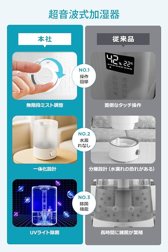 【2025年改良モデル・二重一体化設計】今年の改良点は、蓋と中軸導管を一体化した独自構造です。従来の分離式に比べて加湿の安定性がさらに向上しました。必要に応じて分解できるため、お手入れも簡単です。さらにタンクと台座を一体化することで、水漏れのリスクを大幅に軽減。安定した加湿性能と使いやすさを両立した進化した設計です。(ご注意:水位をMAX以上にすると水漏れの原因となります。集エネルギー環の上下を逆さまに装着しないでください)
