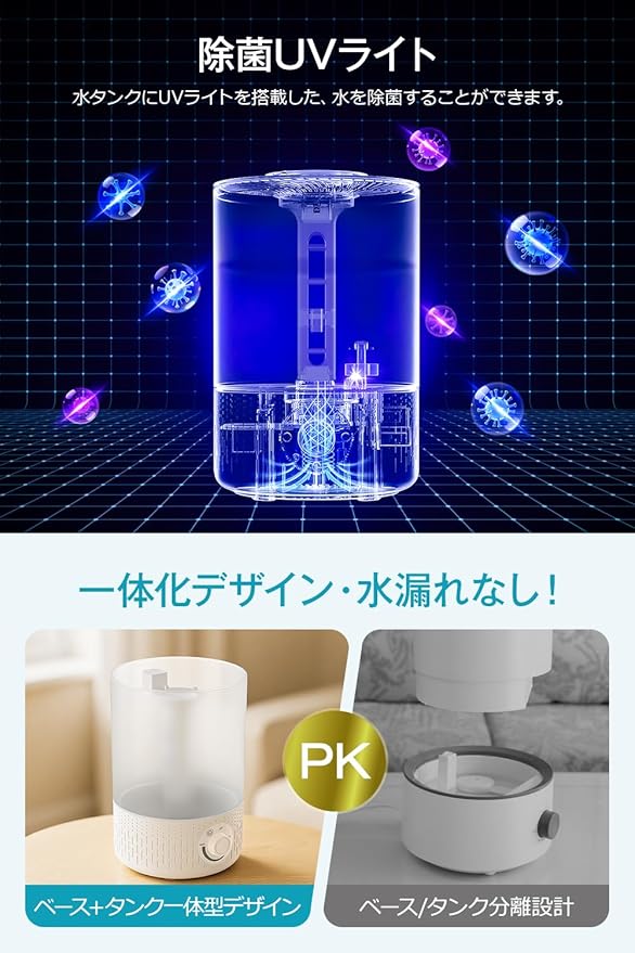 【UVライト除菌・アロマ対応加湿器】UVボタンを押すとライトが点灯し、水中の雑菌を効果的に抑制します。毎回きれいで衛生的なミストをお部屋に届けます。小さなお子様やペットがいるご家庭でも安心して使える仕様。さらに水溶性アロマオイルにも対応し、加湿と同時に香りを楽しめる仕様。衛生面と快適さを兼ね備えた、超音波式加湿器です。