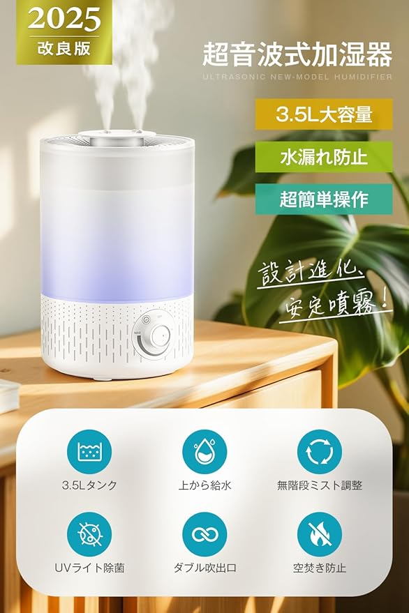 【2025年改良モデル・UVライト除菌】 加湿器 大容量 3.5L 超音波式 加湿器 卓上 おしゃれ アロマ対応 ダブル吹出口 上から注水 無階段ミスト調整 静音 54時間連続作動 吹出口360 調整 空焚き防止 水漏れ防止 寝室/オフィス/会社/家庭用 次亜塩素酸水対応 乾燥対策/花粉症対策 PSE認証済み