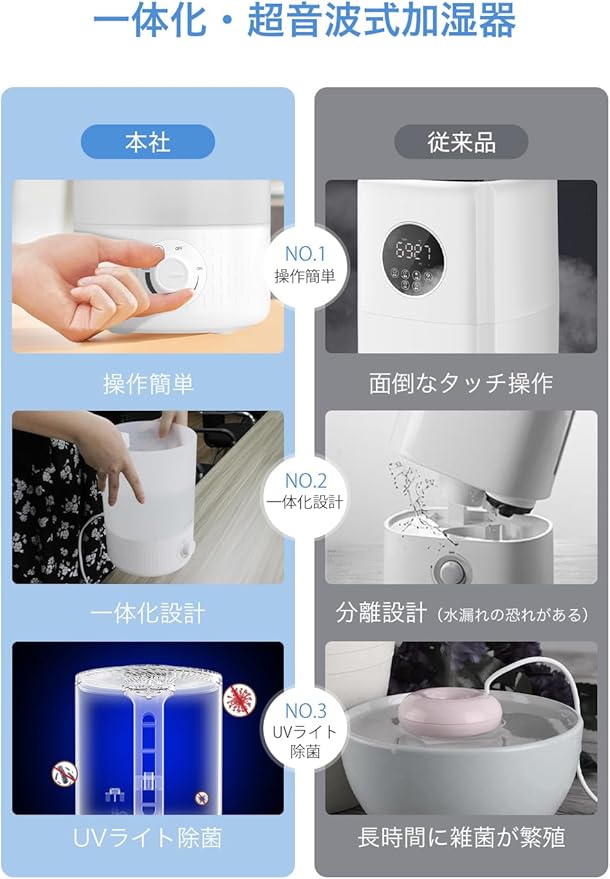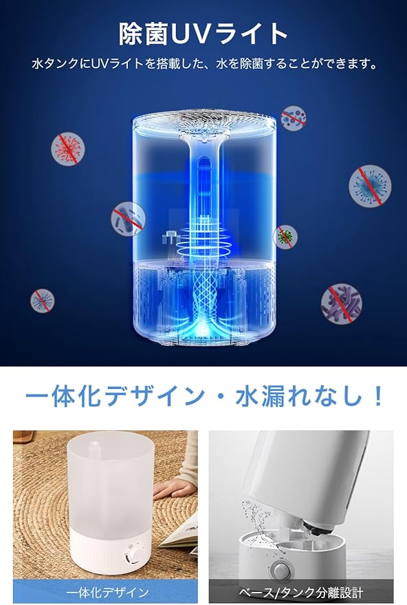 【UVライト除菌・アロマ対応加湿器】UVライトは抗菌機能があり、UVボタンを押すとライトが点灯し、水中の細菌を99%除去します。この加湿器は清潔なミストを放出できます。水溶性のアロマオイルにも対応しており、お好みのアロマオイルをタンクに入れることで部屋全体に心地よい香りが広がります。(注意:次亜塩素酸水を使用する場合は希釈してください。50ppm以下の濃度が推奨されています)